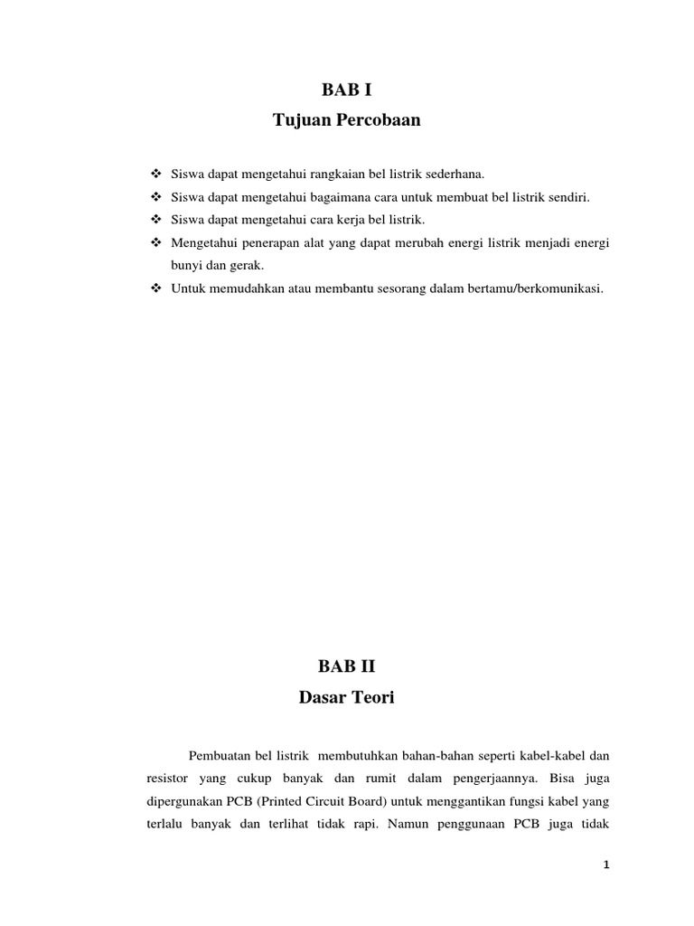 Bel listrik adalah peralatan sederhana yang memanfaatkan sifat kemagnetan. Dilakukan manual tanpa perlu arus listrik.relay yang paling sederhana ialah relay elektromekanis. Dalam perkembangannya dari tahun ke tahun pembuatan bel listrik terus mengalami perubahan. Pada masa kini, bel listrik sudah tersedia dalam bebagai variasi. Dayanya tidak akan pernah habis dan bisa diperbarui. Ketika ada tamu,misalnya maka orang tersebut tidak perlu. Rekomendasi kami untuk sumber energi listrik sebaiknya menggunakan adaptor dibandingkan baterai, karena adaptor dapat mensuplai arus yang cukup konstan untuk kebutuhan bel. Meskipun saat ini banyak bel yang menggunakan sistem elektronik, bel listrik yang menggunakan prinsip gaya elektromagnet ini masih banyak digunakan. Bel listrik bekerja menggunakan prinsip elektromagnetik yaitu pembuatan magnet sementara dengan cara dialiri arus listrik. Bab i pendahuluan 1.1 latar belakang bel listrik adalah suatu alat yang mampu menghasilkan suara dari adanya perubahan energi listrik menjadi magnet (yang nantinya menimbulkan energi gerak yang berfungsi sebagai sumber pelaku timbulnya suara). Sebab bel listrik ini menggunakan konsep fisika yaitu listrik magnet. Dinamakan arus searah karena arus listrik mengalir terus menerus dari kutub positif ke kutub negatif. Berangkat dari tugas kuliah mengenai pemberdayaan media belajar ipa yang dikerjakan secara kelompok, akhirnya saya dan beberapa rekan kelompok mulai mencoba membuat media belajar dalam bidang ipa yaitu bel listrik.
