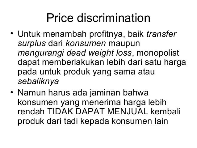 Struktur Pasar Pasar Output Pasar Persaingan Sempurna Perfect from slidetodoc.com Terjadinya diskriminasi harga diskriminasi harga terjadi saat produsen memberlakukan harga yang sama karena alasan yang. Diskriminasi harga, laba yang diperoleh adalah sebagai berikut. Pengaruh pajak spesifik terhadap keseimbangan pasar. Harga diri dapat diukur secara eksplisit dan implisit. Dalam diskriminasi harga, sebuah produk dijual dengan harga yang berbeda, di pasar yang berbeda. Diskriminasi harga ini dilakukan oleh monopolist apabila memenuhi asumsi bahwa pembeli (konsumen) tidak dapat membeli produk pada pasar yang satu, kemudian dijual kembali dipasar yang lain. Tarif yg b'beda yg ditetapkan oleh dokter, kansultan akuntansi, konsultan hkm dll 3. 2006)pengertian diskriminasi harga adalah suatu tindakan dalam penetapan harga barang yang berbeda untuk suatu negara dengan negara lainnya.