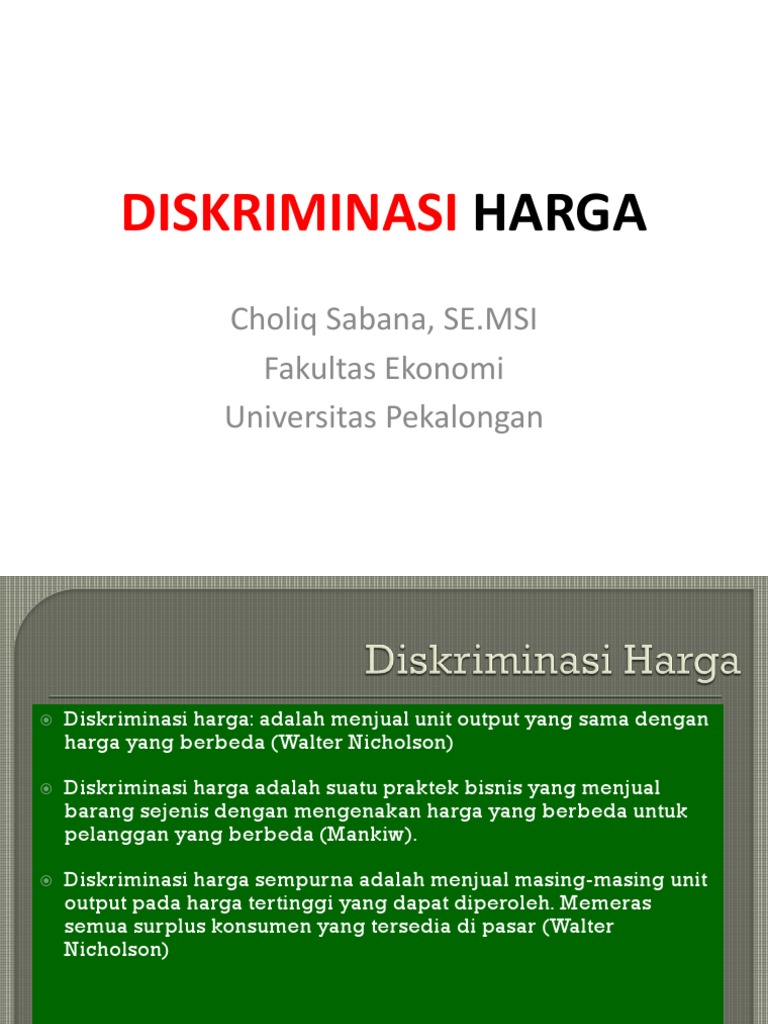 Rumus Diskriminasi Harga - Harga Dan Output Di Pasar Monopoli Murni Revisi Pdf Txt : Diskriminasi harga merupakan salah satu bentuk hambatan masuk (barrier to entry) yang dilakukan monopolis untuk menghalangi masuknya perusahaan lain ke dalam pasar yang dikuasainya.