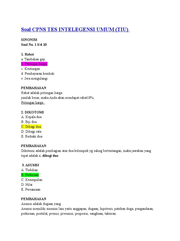 1 cnth sal dan jawaban tes intelegensi umum (tiu) berikut adalah cnth sal beserta jawaban dan pembahasannya yang saya ku. Kumpulan latihan soal cpns 2021 pdf terbaru beserta kunci jawaban. Terdapat juga latihan soal cpns sistem cat dan pdf lengkap. Top pdf kunci jawaban contoh soal tes intelegensi umum dikompilasi oleh 123dok.com. Gratis dan pembahasannya pdf, download video youtube pembahasan soal tiu cpns, .